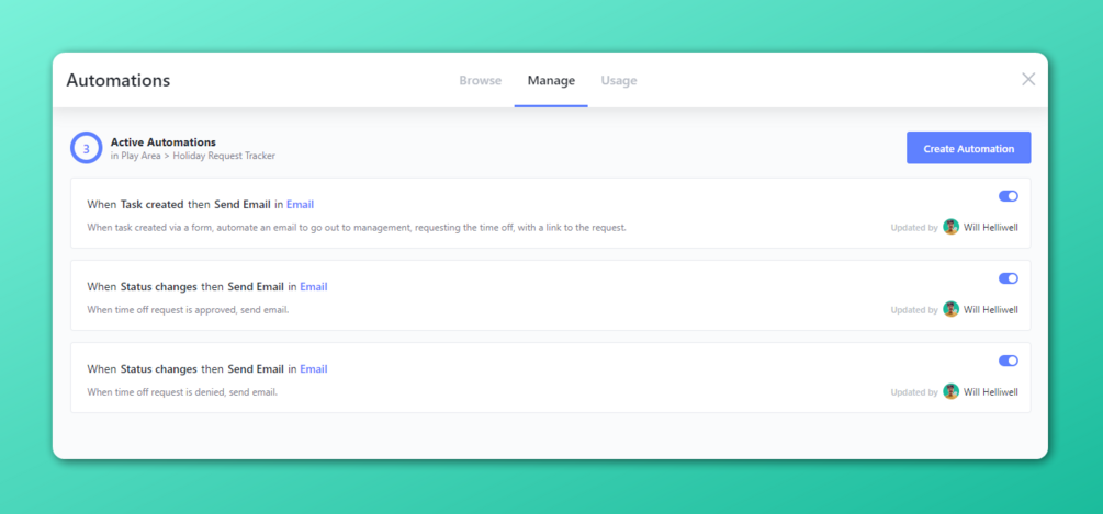 Note: Automations aren't included in ClickUp templates. The walkthrough document explains how to make and customise your own. You'll need to have the email integration enabled on ClickUp to send automated emails.