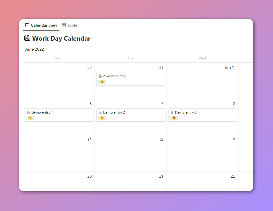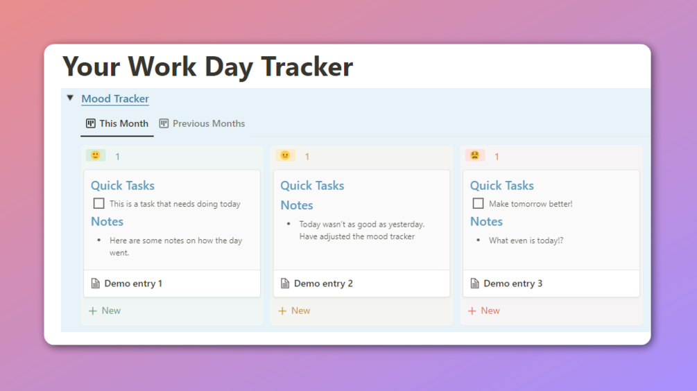 Your work day tracker has a space to quickly track your mood. Look back over your previous months and see how your mood has been at a glance.